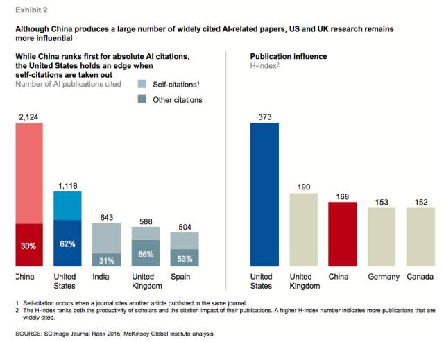 表2:左图按AI相关的论文数量排名,右图按 H-index 排名。虽然中国发表了大量被广泛引用的 AI 相关的论文,但论影响力仍是美英更大。中国在绝对引用方面排名第一,但去除自引(self-citation)后,美国更有优势。