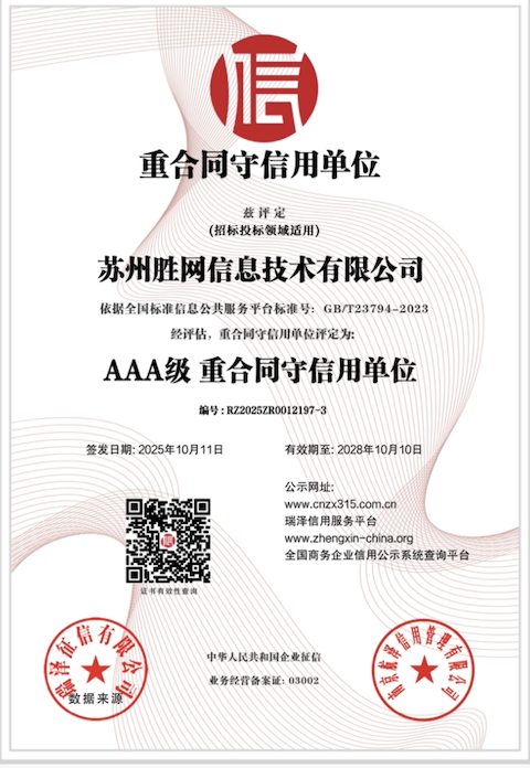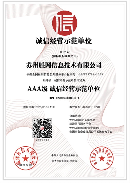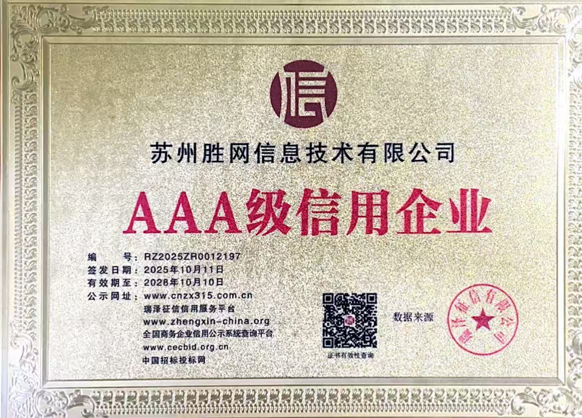 此次荣膺“AAA级信用企业”,是苏州胜网发展历程中的重要里程碑。我们坚信,在以信用为基石的航道上,苏州胜网信息技术有限公司必将乘风破浪,引领IDC行业迈向更加规范、透明和可靠的明天,成为赋能千行百业数字化转型的坚实后盾。